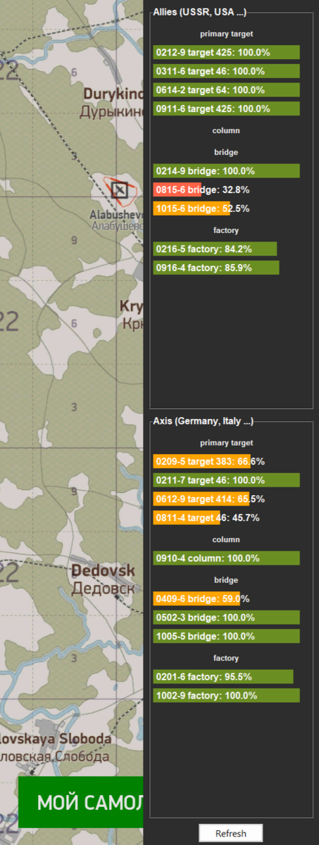 3. screen_obj_status_eng.png - collapsible side panel showing map target statuses. Updates every 30-90 seconds, includes a refresh button that can be pressed once every 30-90 seconds. The panel appears in movement mode when the mouse pointer approaches the right edge of the screen.