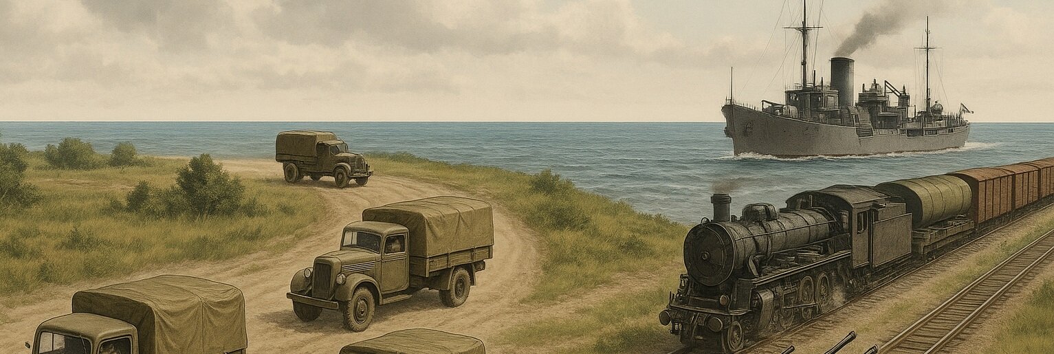 38. В кампании FRONT LINE, где исход каждой миссии зависит от точного расчёта, крепкой координации и непрерывной логистики, снабжение аэродромов становится не просто вспомогательной функцией, а одной из ключевых механик выживания на многопользовательском сервере FRONT LINE. Система снабжения здесь — это не просто фоновая часть игры, а целый комплекс процедур, от которых зависят успехи в бою, возможность полетов авиации и готовность пилотов к поддержке наземных войск. Корабельный конвой снабжения Способы снабжения аэродромов.Всего есть три основные механики снабжения аэродромов: Снабжение транспортными колоннами и т.п. (наземная техника). Снабжение транспортными самолетами. Снабжение самолетами не транспортной авиации (Только пополнение. Восстановление разрушений невозможно!) Механики пополнения ресурсами и восстановления разрушений на аэродромах, а так же аэродромные ресурсы детально описаны в статье "Аэродромы - ворота в небо" в пункте "Восстановление разрушений и пополнение аэродромов ресурсами" поэтому здесь они рассматриваться не будут. Вместо этого будут описаны условия для снабжения, разведка и обнаружение, процесс загрузки грузовиков и других объектов ресурсами, механика снабжения транспортной авиацией и другое. Типы снабжения аэродромов наземным транспортом.Существует три основных способа доставки наземным транспортом ресурсов до аэродромов и их можно условно разделить на типы: Автомобильная колонна — наиболее часто встречающаяся форма снабжения. Они используются для доставки боеприпасов, топлива и провизии. Автоколонны в своем составе имеют — до трех мобильных зенитных установок и транспортные автомобили. Автомобильная колонна способна перевезти до 50 тонн ресурсов (суммарно). Железнодорожное снабжение — подвозит все три типа ресурсов, в увеличенном количестве относительно автоколонн. Поезда движутся от заводов к аэродромам, у которых в непосредственной близости есть железнодорожная инфраструктура. Защищены они сильно — в специальных капонирах установлены крупнокалиберные и мелкокалиберные пушки, что обеспечивает умеренную оборону от налётов. Максимальное количество перевозимых ресурсов железнодорожным способом - 75 тонн (суммарно). Морские конвои — доставляют максимально возможное количество ресурсов, и способны действовать на любом удалении от берега, но доставляют провиант только на аэродромы у береговой линии. Они защищены средней зенитной артиллерией и используются преимущественно на картах с морским сообщением. Масса перевозимых грузов до 100 тонн (суммарно). Автомобильная колонна снабжения на марше. Условия для снабжения аэродромов.Аэродромы как живой организм, они непрерывно расходуют ресурсы, что несомненно требует оперативного снабжения. Основным способом снабжения аэродромов являются - наземные перевозки ресурсов (Снабжение транспортными колоннами и т.п.). Для этого генератор при создании следующей миссии оценивает количество ресурсов на аэродромах и в случае необходимости добавляет до двух аэродромных колонн, которые имеют задачу на миссию - доставить ресурсы на конкретные аэродромы. Поскольку требования на снабжение могут поступить от многих аэродромов, генератор выбирает (имеет только две попытки установить в миссию колонны снабжения) до двух (на каждую сторону) наиболее н